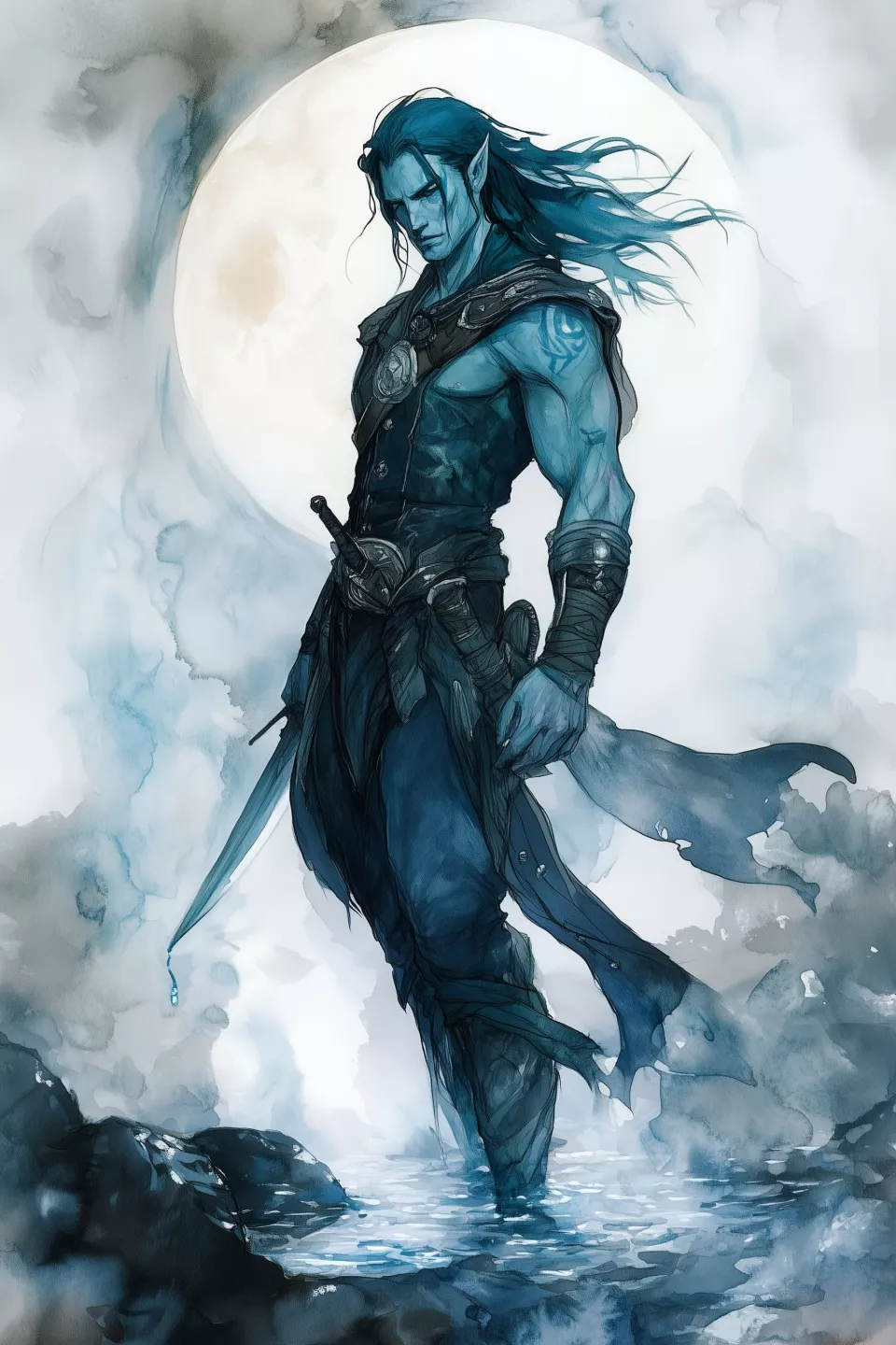 Jendric Talsorian is tall and lanky, clothed in layered robes of deep midnight blue that trail the ground. His skin has an ashen pallor, contrasting with unruly locks of fiery orange hair that flare wildly around his head. A network of dark, inky tattoos spirals across his forearms, echoing the mystical symbols etched into the ivory grip of the intricately carved staff he wields.