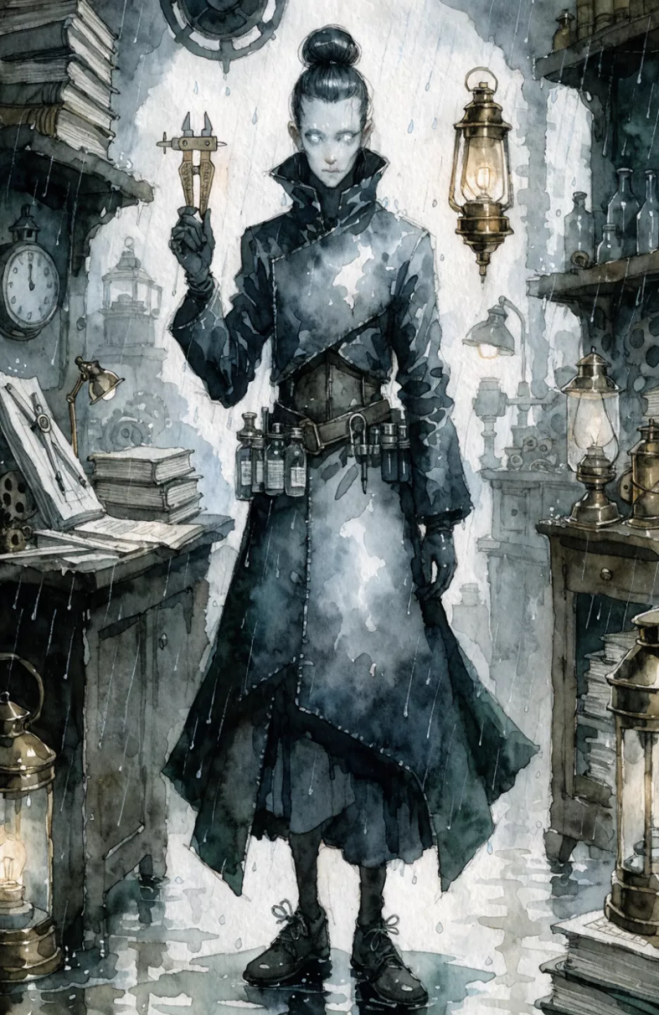 Selune Xirathis wears a raincoat of stitched moth-silk that never smells of weather—ink-dark inside, moonlit outside. Their luminous eyes pulse softly when they measure distances, and they tap a brass caliper against their knuckles to settle disputes. In a workshop of gears and prayer-books, they file contracts into small lockboxes, leaving no loose words behind. When asked why, Selune quotes the clause, not the person.