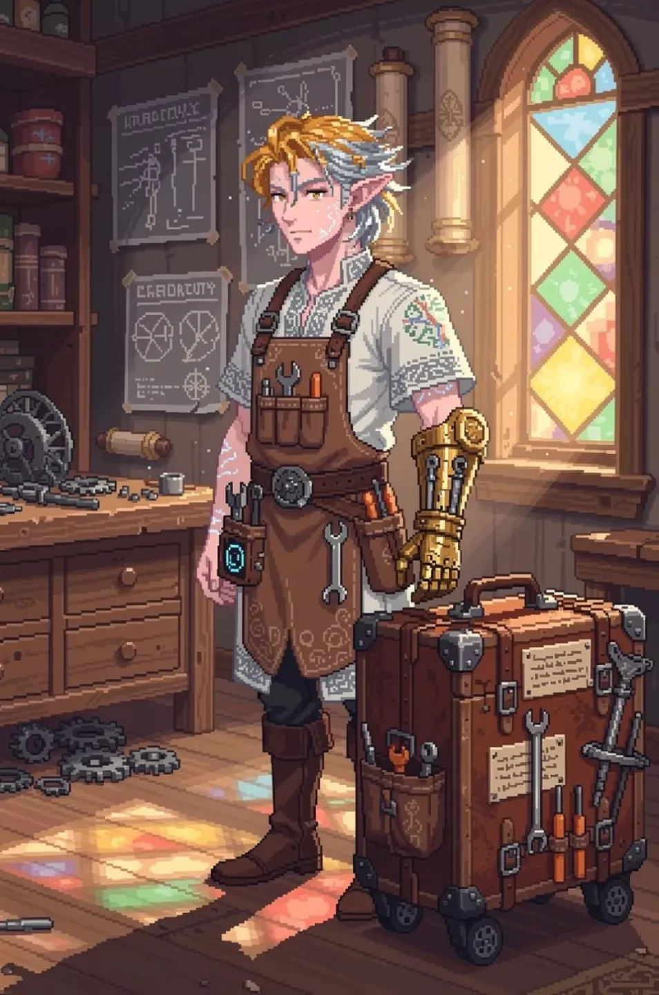 Veythran Elunora keeps his tools in a wheeled case with pinned labels—each part has a clean place, each spring gets wound “clockwise or not at all.” His Eladrin skin turns faintly translucent when he’s annoyed, and his hair seasons through muted silver-ice to autumn-gold between blinks. Last year, a mislabeled counterweight dropped a wagon and killed a council page; now he measures twice, contracts everyone’s work in writing, and never lends a caliper.