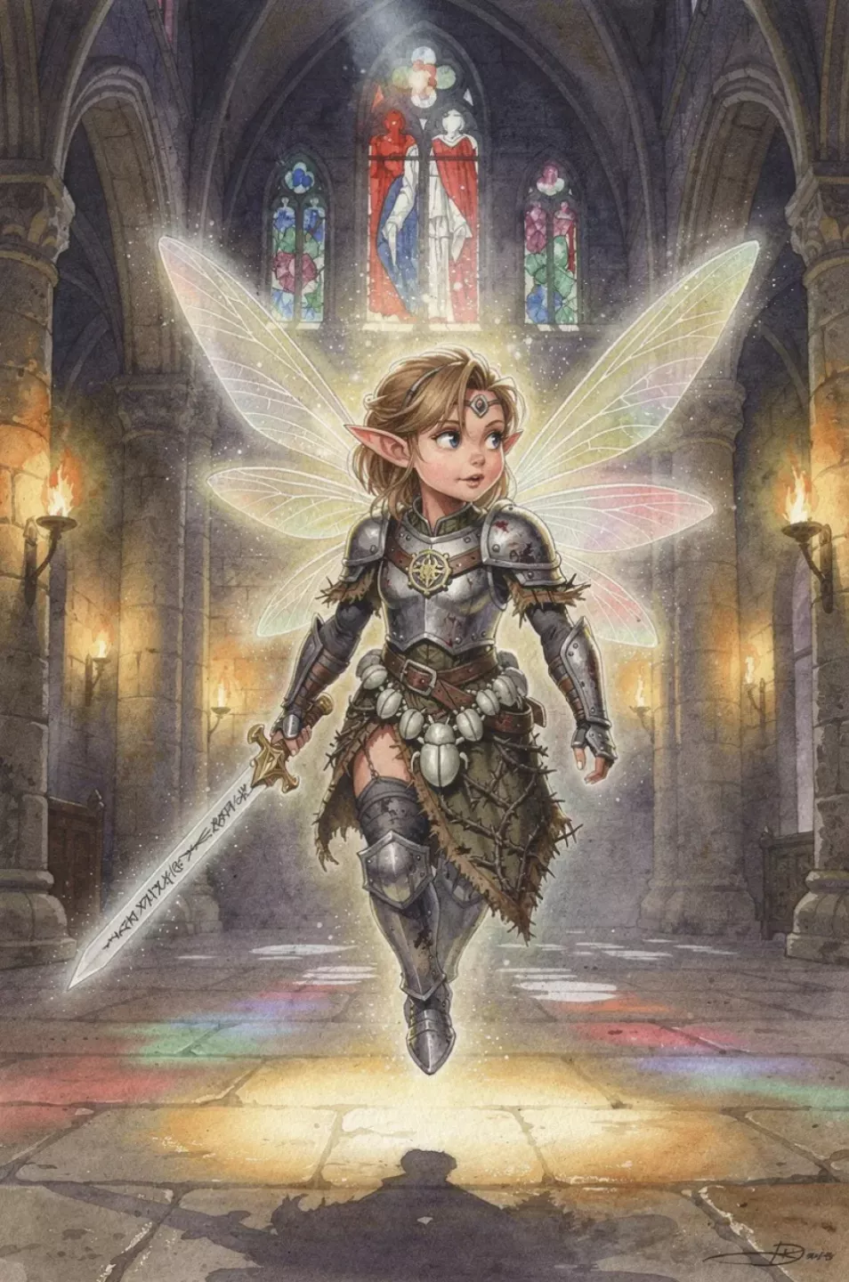 Xaletera Nighthaven is too small for the oaths she carves into other people’s lives. Her translucent insect wings click softly behind her as she floats just off the ground, leaving a faint, pale shimmer in torchlight. A nickel-sized holy symbol hangs on a chain of bone-white beetle shell. She wears a dented tin breastplate over a stitched, thorny surcoat, and her blade is etched with names she never shares.